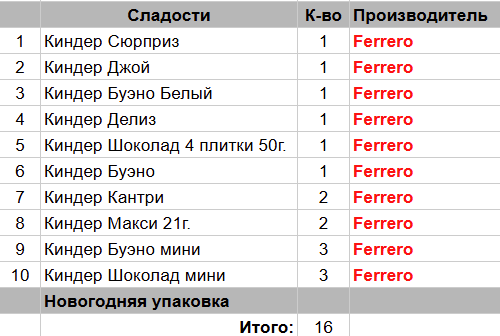 Киндер Сюрприз (1 шт), Киндер Джой (1 шт), Киндер Буено Белый (1 шт), Киндер Делиз (1 шт), Киндер Шоколад 4 плитки 50 гр. (1 шт), Киндер Буено (1 шт), Киндер Кантри (2 шт), Киндер Макси 21г. (2 шт), Киндер Буено мини (3 шт), Киндер Шоколад мини (3 шт)